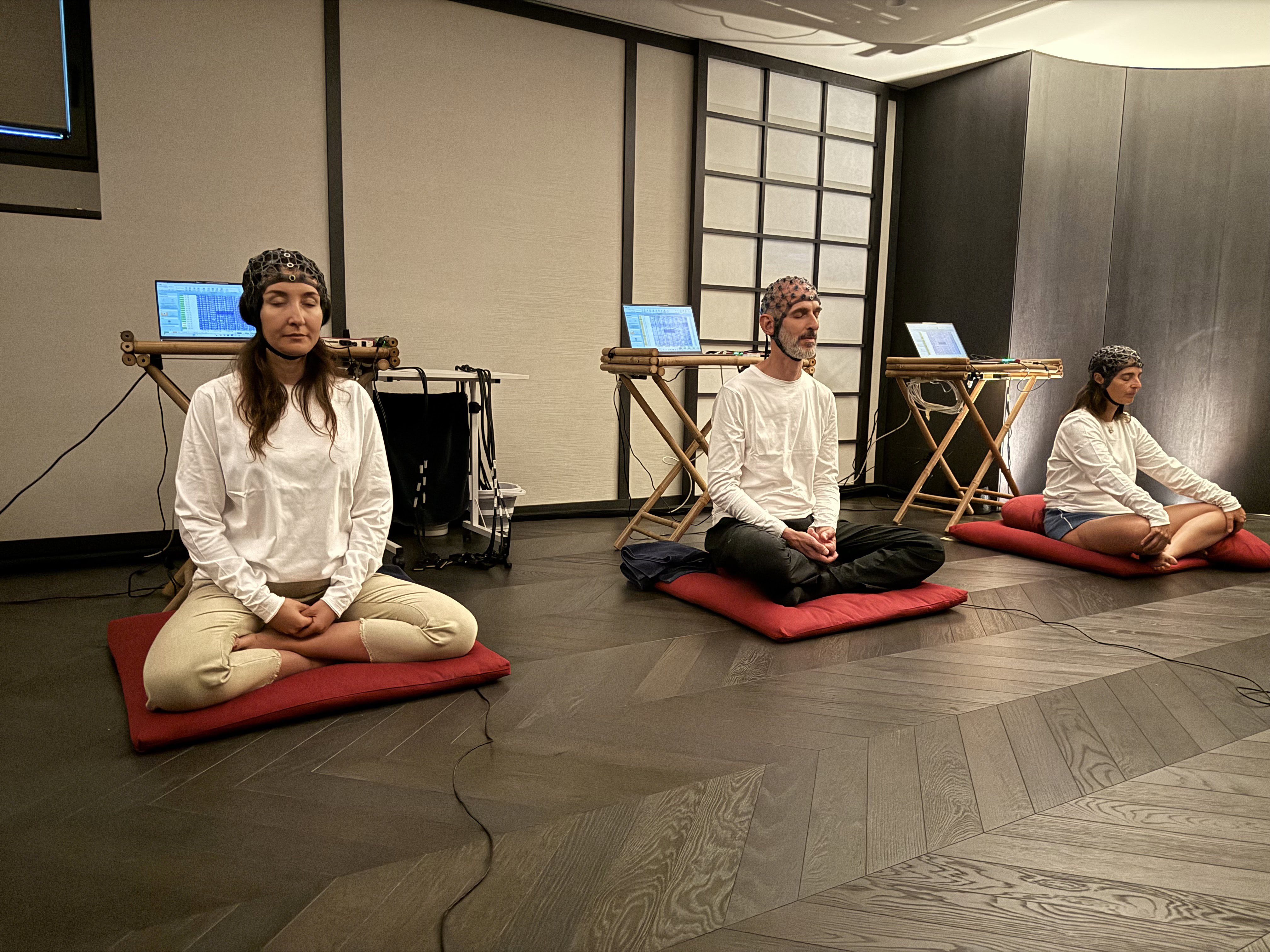 スイス連邦工科大学ローザンヌ校(EPFL)、ジュネーブ大学、東京大学、S-VYASA大学、ANT Neuroなどの研究機関と連携し、EEG(脳波)を使った最新技術で瞑想の深さを科学的に測定しています。さらに、All HereはXR(拡張現実)による没入型瞑想プラットフォームを開発し、リラックスから深い瞑想状態まで段階的に体験できる環境を提供しています。