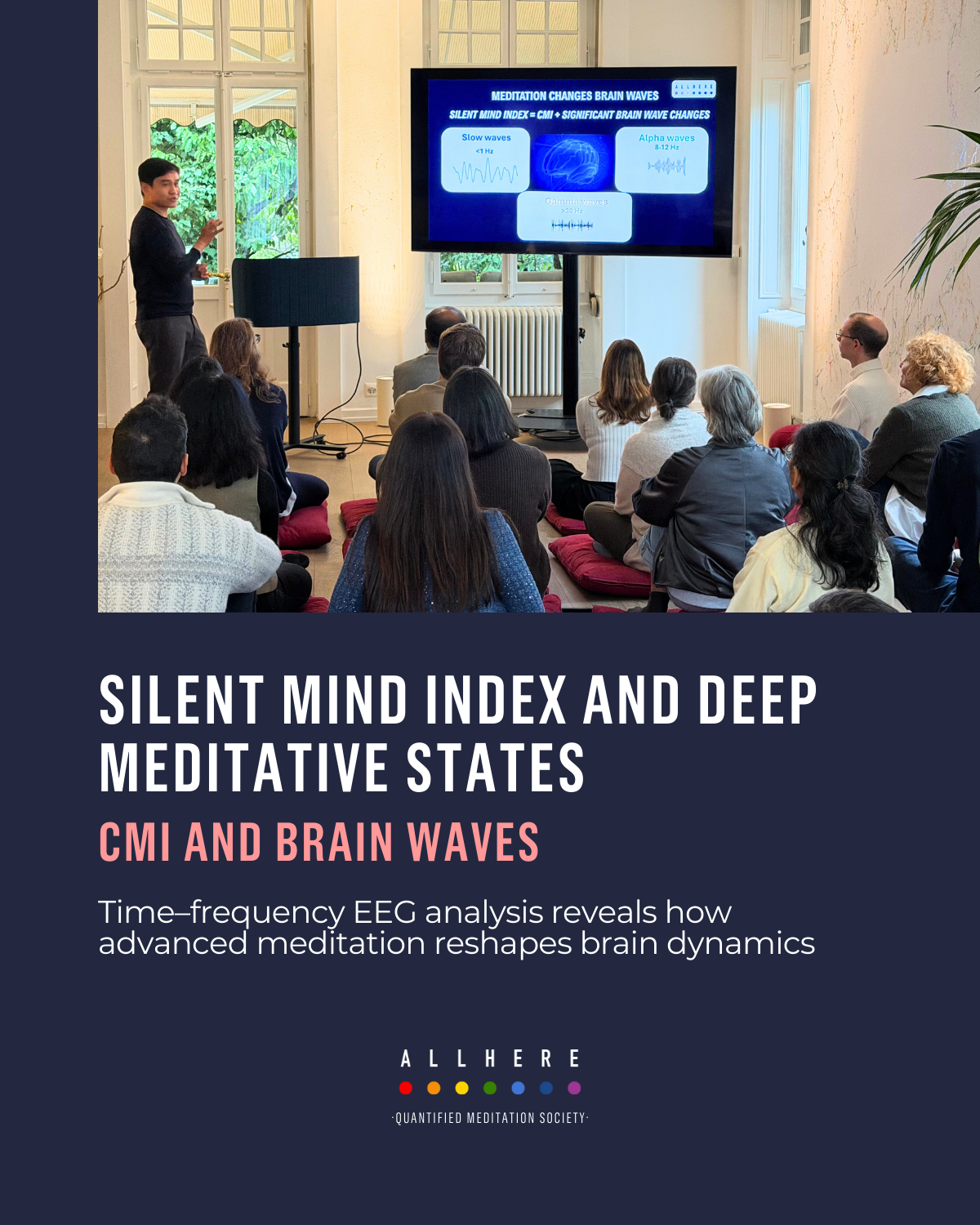 Monika Stasytytė presented All Here’s research on meditation’s effects, highlighting microstates, dynamic neuroimaging, and integration into our Concentration and Mindfulness Index (CMI) and QM³ — a measure of sustained deep meditative states. The All Here Quantified Meditation System (QMS) computes and displays these metrics in real time.